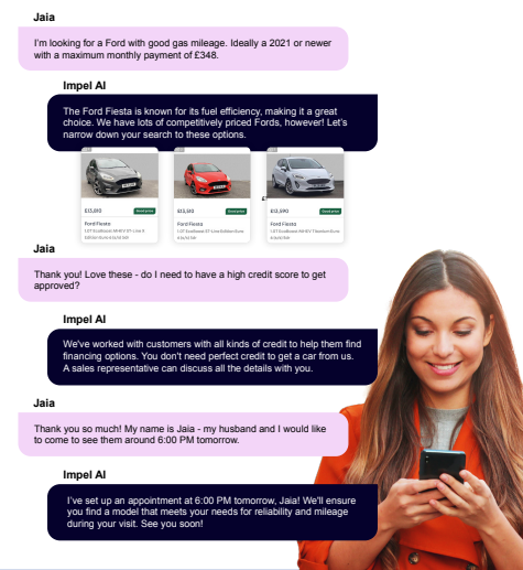 - Impel AI: Confirms the appointment, ensuring Jaia will find a model that meets her needs for reliability and mileage.